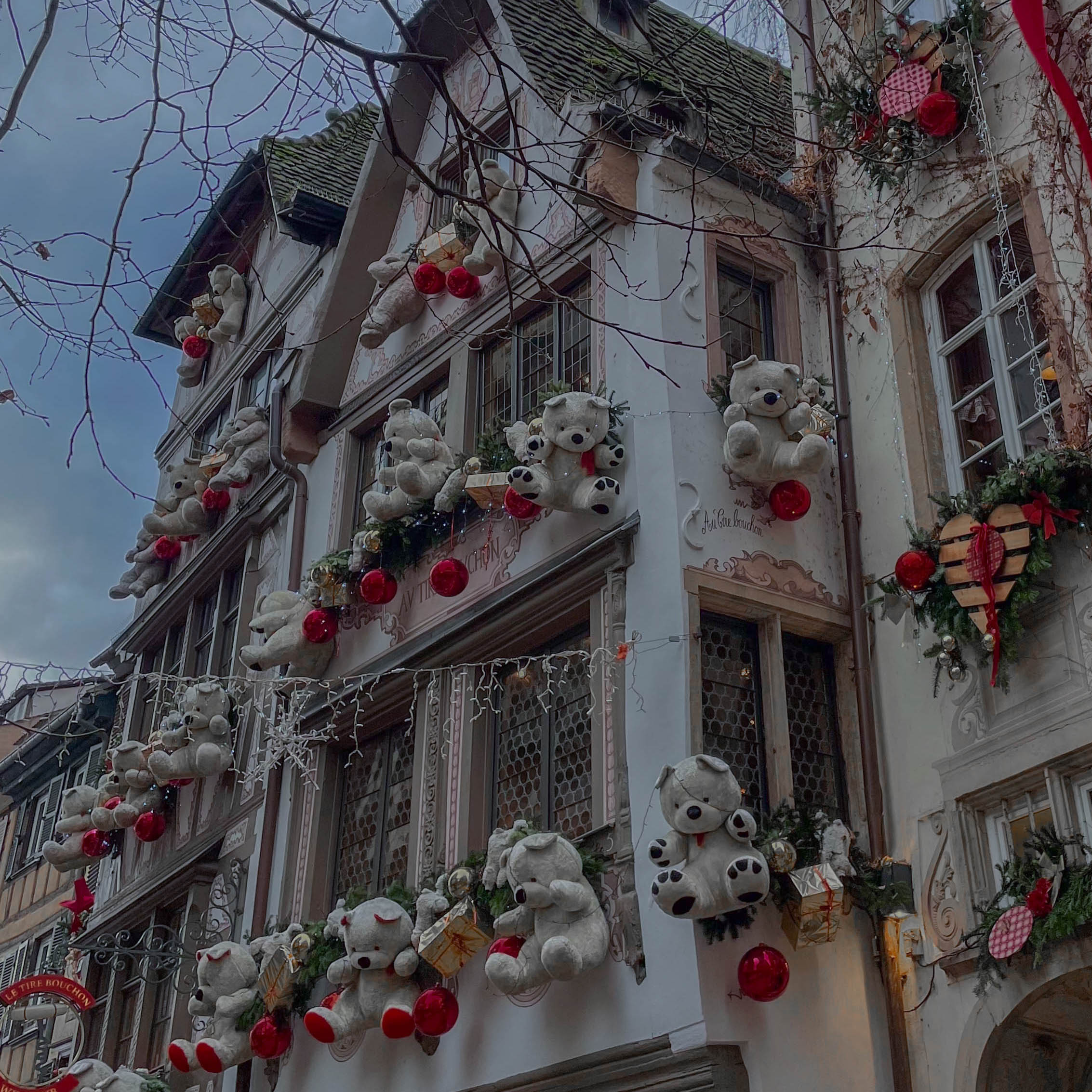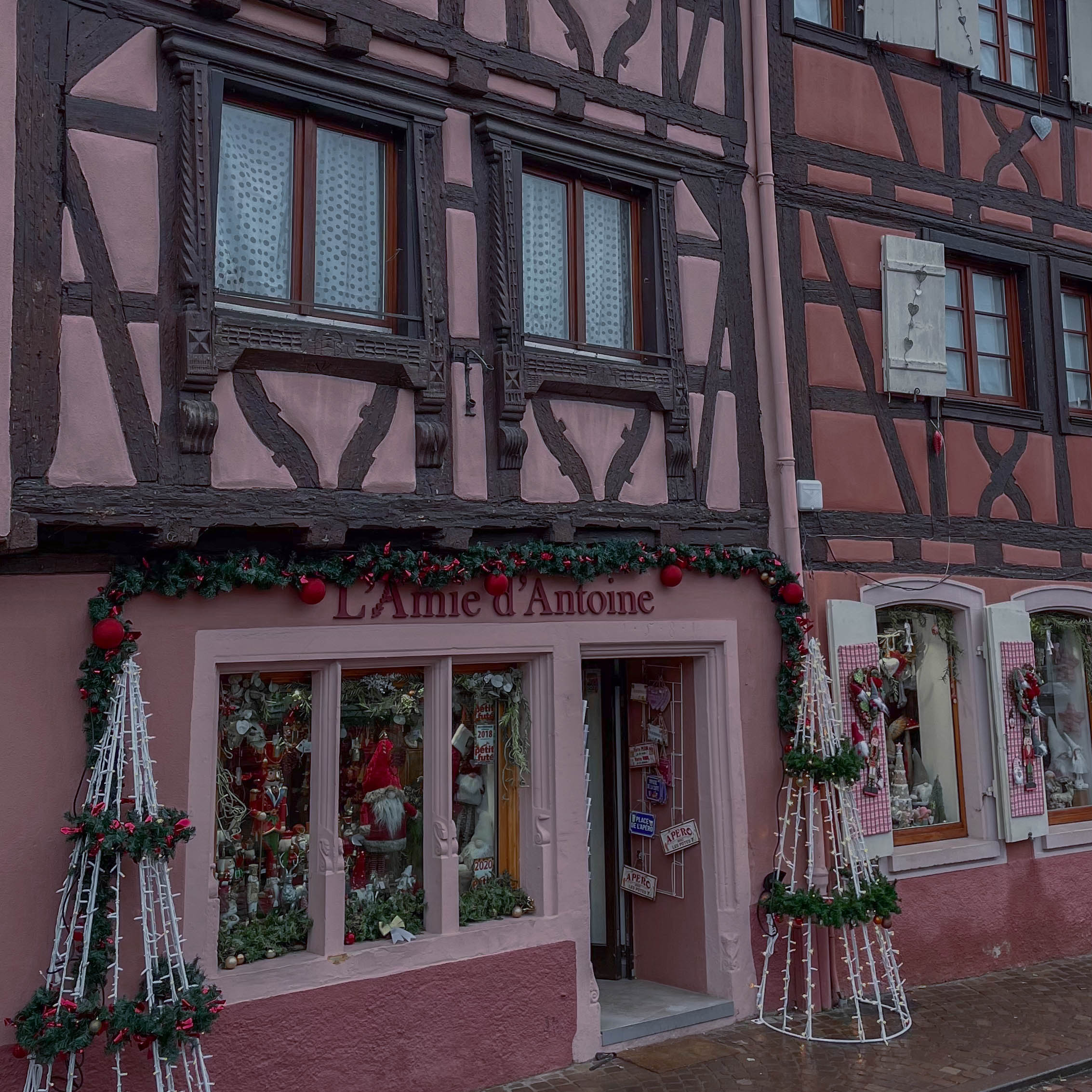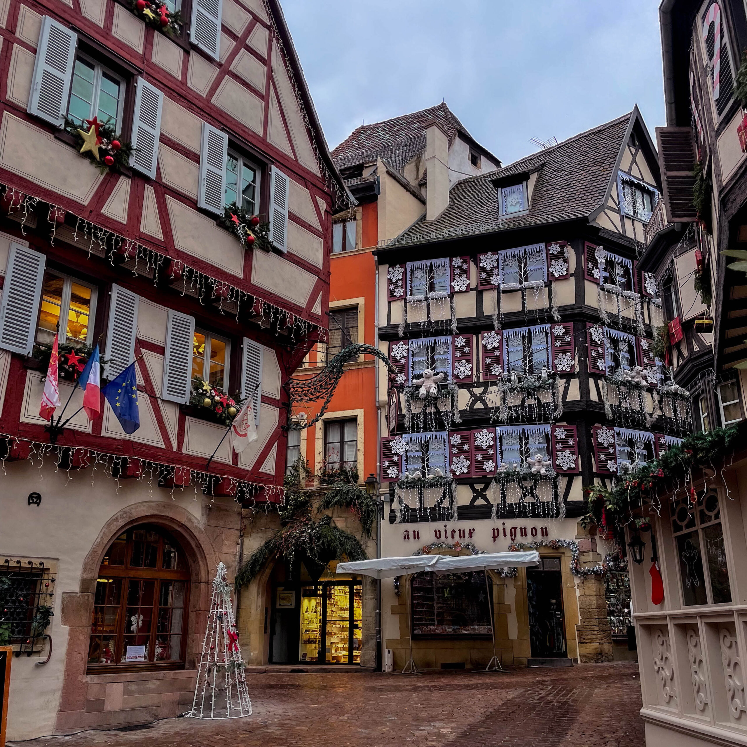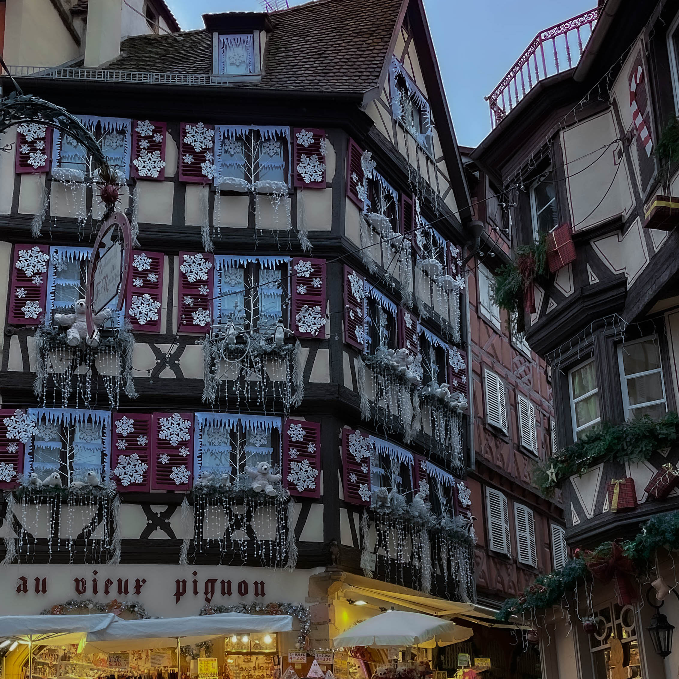 A little further off the main street of Grand Rue, you will find the second most photographed spot in Colmar called “Au Vieux-Pignon”. This famous building is a souvenir shop with a gorgeous façade. During Christmas, you will be able to admire not only its vibrant colors, but also the amazing Christmas decorations. The whole street is extremely charming. If you want to capture it empty, you should get there as early as possible, since it gets even busier than the “Pink House” spot! You should also take a look at the souvenir shop, as it has many adorable souvenirs.