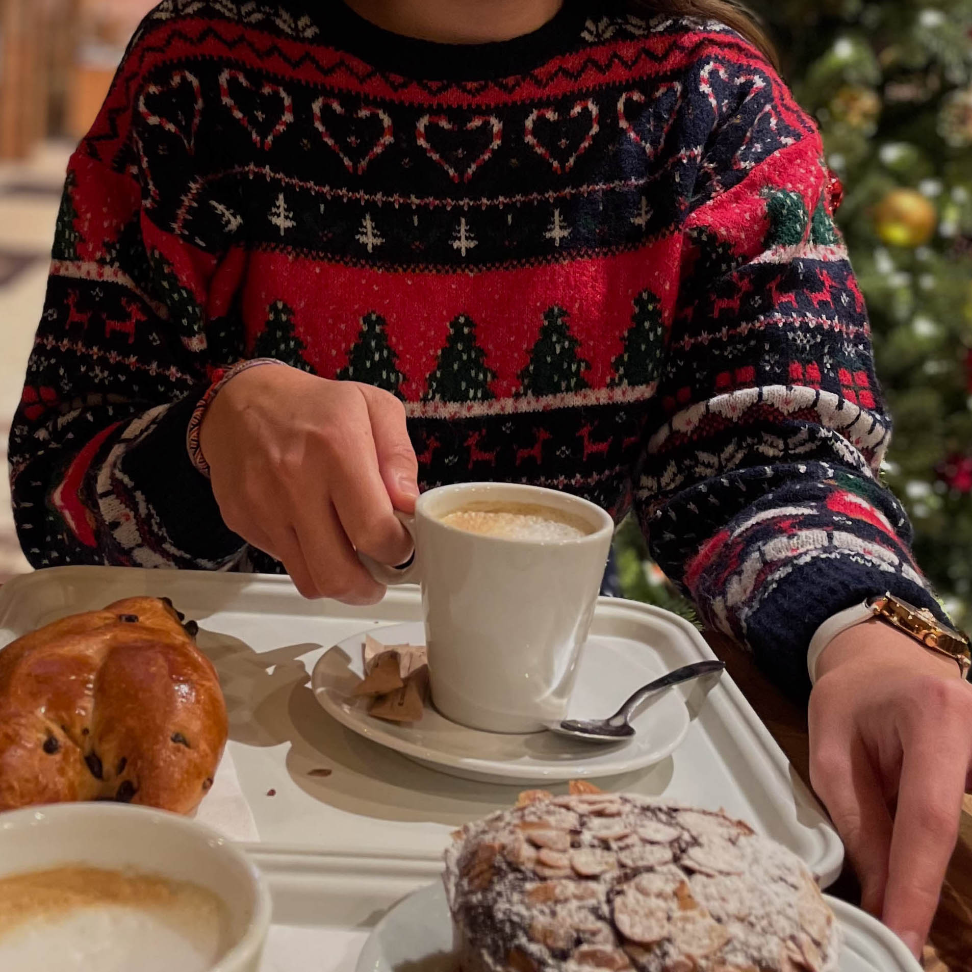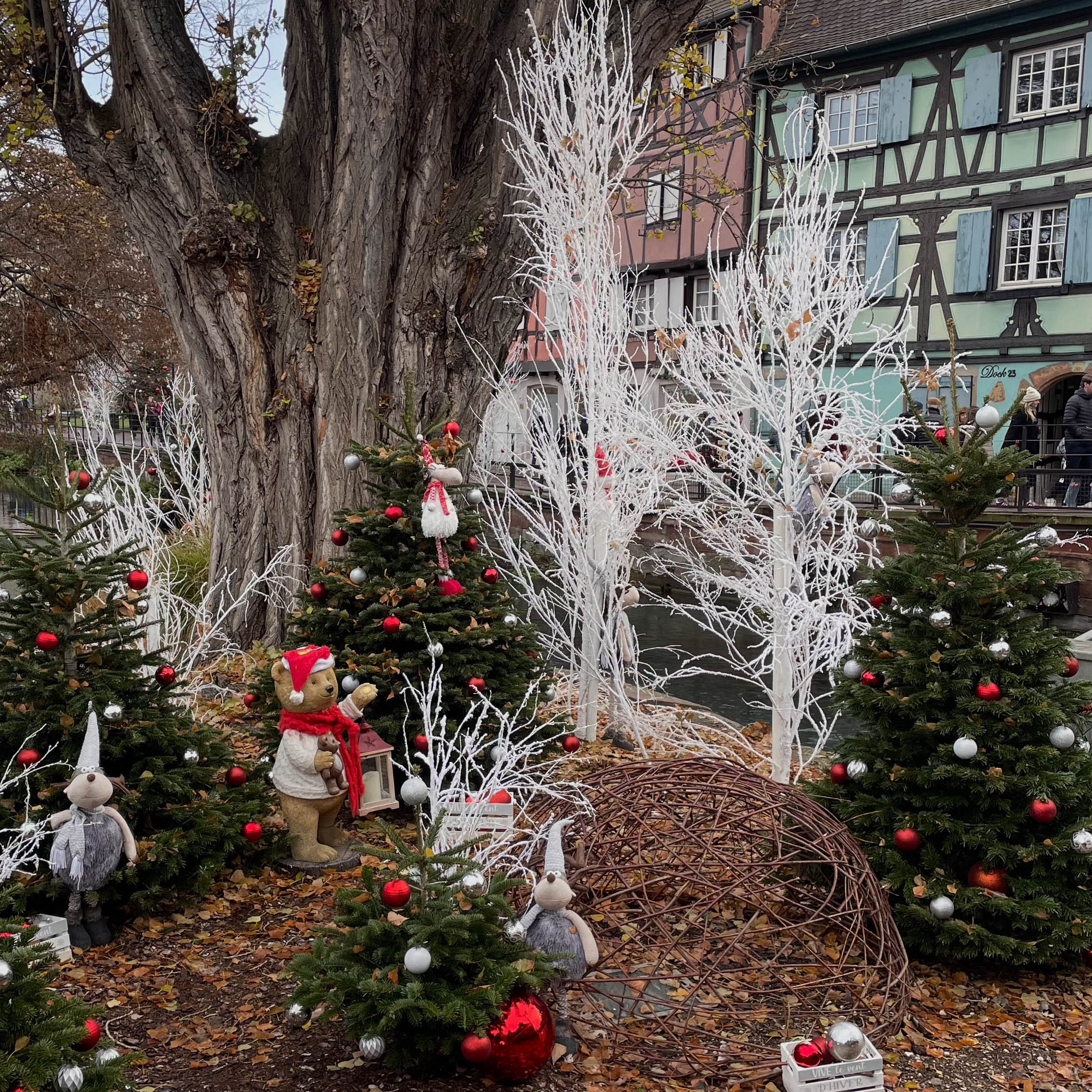 Another incredible spot in town is the Quai de la Poissonnerie, where you will find the Gourmet Christmas market. Because of the canals, it gives off similar vibes, like the Children’s Christmas market. This Christmas market has perhaps even prettier Christmas decorations, such as small and big Christmas trees, cute teddy bears, etc. We visited it on our last day in Colmar and had an amazing time wandering around and admiring the ornaments. A few meters from the Christmas market, you will find the Ferris wheel. If you are traveling as a family, we highly recommend it.